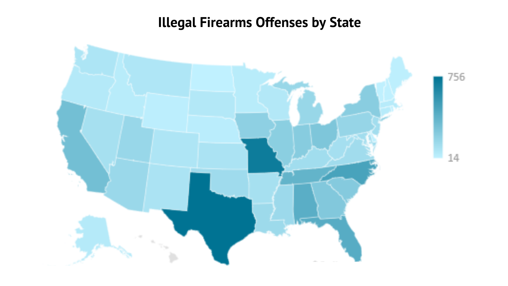 Federal courts in Texas and Missouri had the highest total firearms offenses by a wide margin, with 756 and 704, respectively. Most firearms offenses were concentrated in the South, with North Carolina, Florida, Alabama, and Tennessee also making the top 10. The fewest firearm offenses occurred in Hawaii, Guam, and the U.S. Virgin Islands.